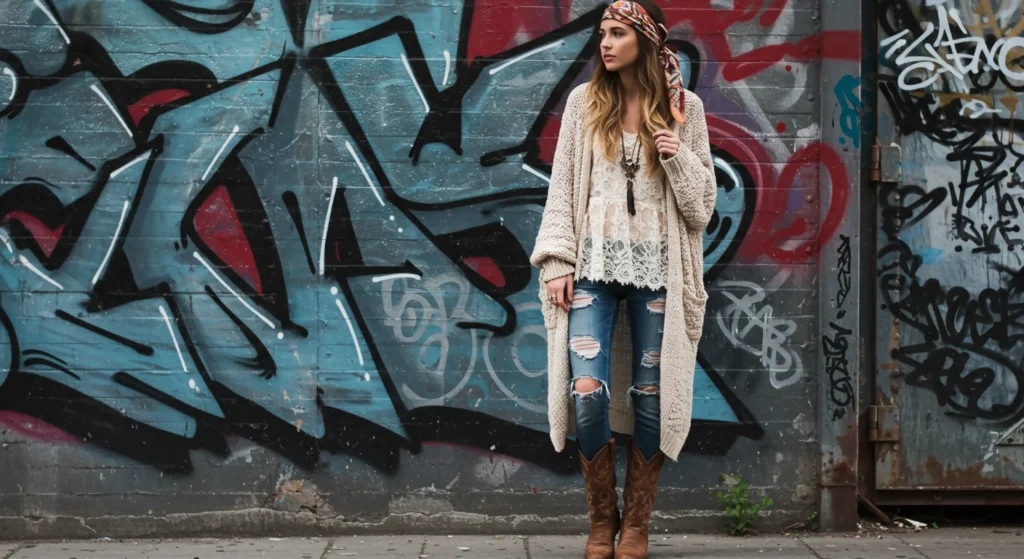Calça jeans destroyed + blusa de renda + cardigã de tricô + bota de cowboy + lenço estampado no cabelo: Um look moderno e cheio de atitude.