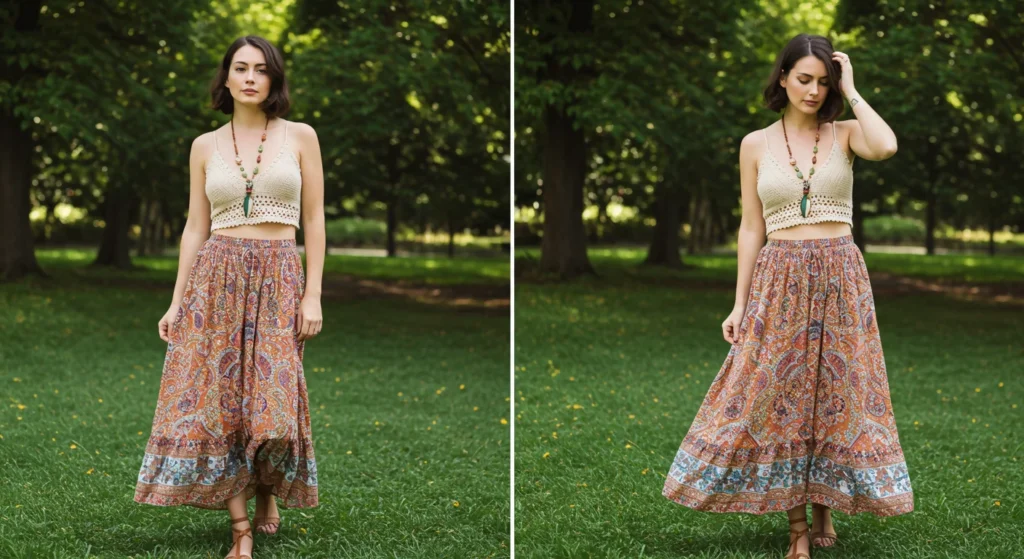 A base de um guarda-roupa boho chic é composta por peças confortáveis, fluidas e com um toque artesanal. Vestidos longos e esvoaçantes são indispensáveis, seja com estampas florais, bordados ou rendas delicadas. As saias também têm um papel importante, principalmente as de cintura alta e comprimento maxi, que podem ser combinadas com blusas soltinhas ou croppeds.