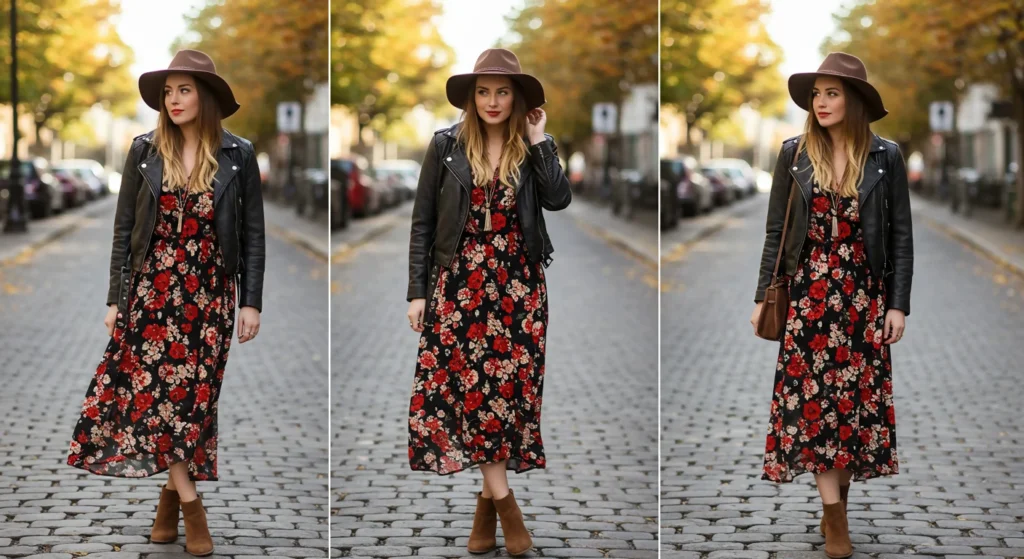 Vestido longo floral + jaqueta de couro + bota de cano curto + chapéu de feltro: Um look clássico e infalível para qualquer ocasião.