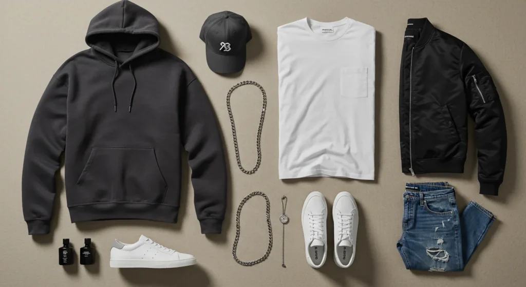 Acessórios Marcantes: Bonés, tênis, óculos de sol, correntes e mochilas complementam o look, adicionando um toque pessoal e funcional.